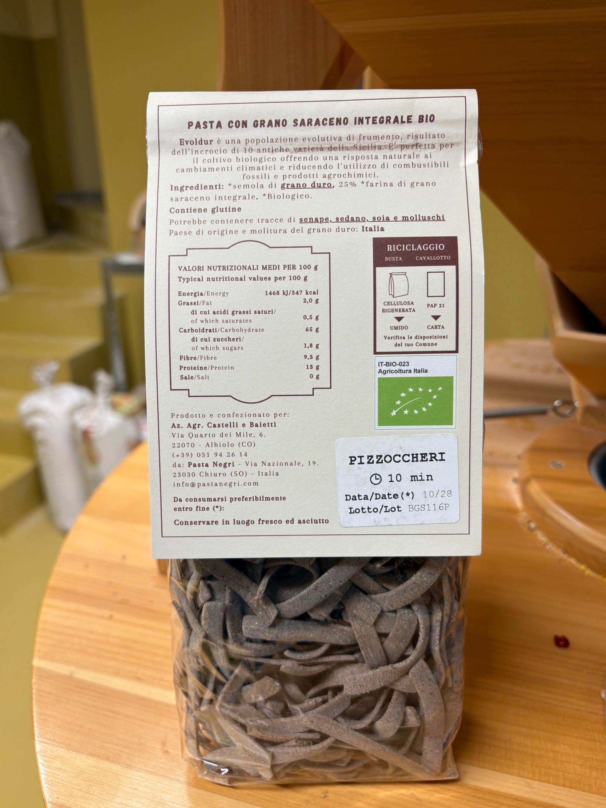 Pizzoccheri artigianali biologici, realizzati con una miscela composta da: grano saraceno e semola di grano duro, coltivati e macinati da noi in metodo biologico.